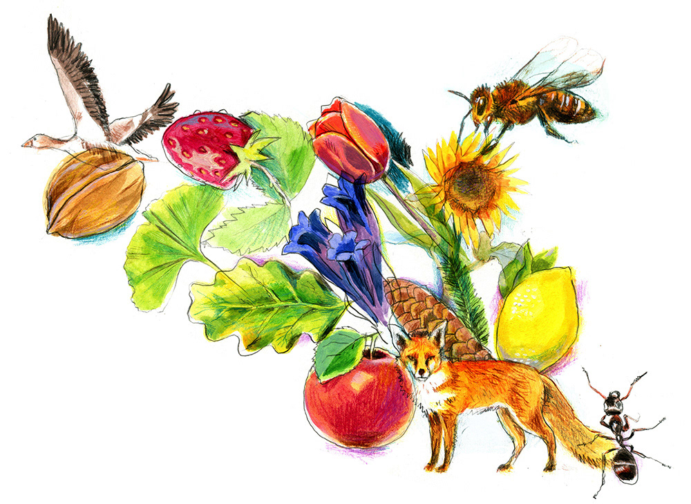 Locker und dennoch auf den Punkt gebracht in seiner typischen Erscheinung ist eine Serie an Zeichnungen von Tieren und Pflanzen entstanden.
